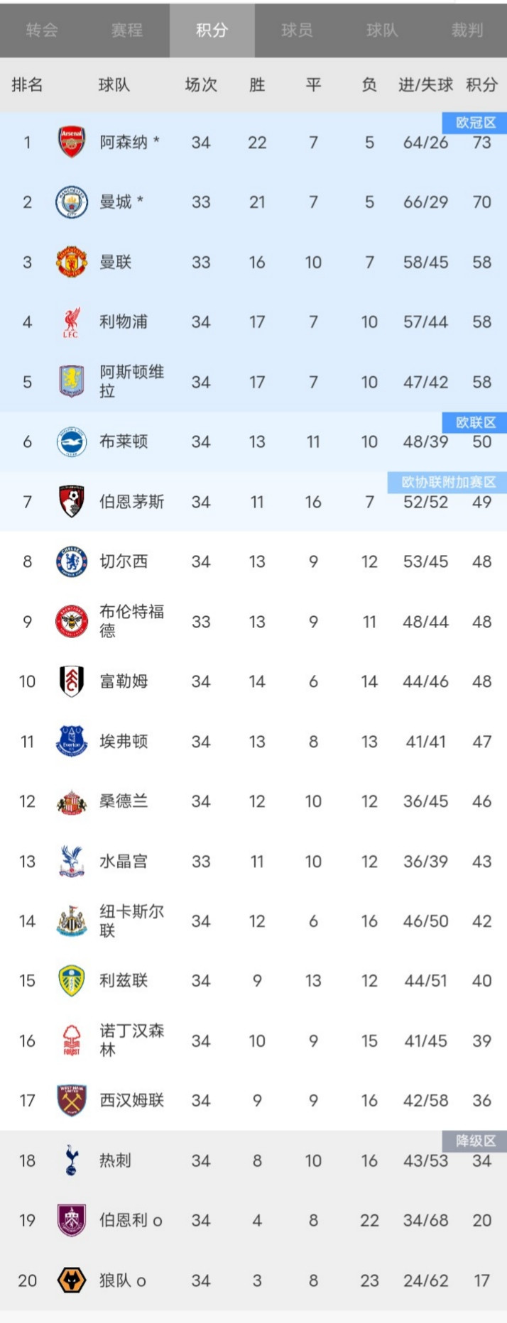 布莱顿3-0完胜切尔西,蓝军遭遇联赛五连败,争四希望彻底破灭;伯恩茅斯与利兹联2-2战平,双方各取一分,保级区形势胶着;曼城1-0小胜伯恩利,哈兰德打入制胜球,同时送对手提前降级;诺丁汉森林客场5-0横扫桑德兰,拿下一场大胜,为保级增添关键三分;富勒姆1-0力克阿斯顿维拉,终结了对手的6场不败,也让维拉的争四优势被进一步压缩;利物浦3-1击败水晶宫,拿下关键三分,继续冲击欧冠区;西汉姆联2-1逆转埃弗顿,在保级大战中占据上风;热刺客场1-0战胜狼队,拿下保级关键战,依旧还在降级区。